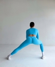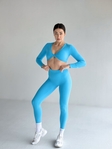 Сміливий та стильний комплект у яскравому бірюзовому відтінку — ідеальне поєднання енергії, впевненості та елегантності. Кроп-топ із довгими рукавами та глибоким V-вирізом створює спокусливий акцент на лінії декольте, а кручена деталь спереду додає динамічності та витонченості. Високі легінси підкреслюють талію й забезпечують комфорт під час руху.Виготовлений із приємної на дотик, еластичної тканини, цей комплект чудово тримає форму та підходить як для тренувань, так і для стильних повсякденних луків.